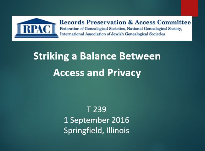 The Federation of Genealogical Societies is celebrating its 40th Anniversary as a featured theme at its Annual Conference this week in Springfield, Illinois. On this occasion, the Records Preservation and Access Committee is presenting a workshop session entitled “Striking a Balance Between Records Access and Privacy” Thursday Afternoon the 1st of September at 3:30pm CDT in Room B1 of the Springfield Conference Center.